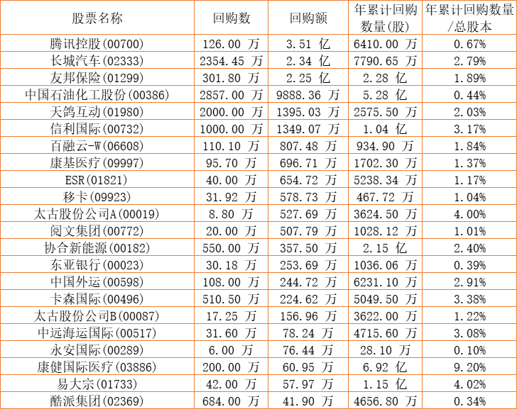 长城汽车(02333)、永安国际(00289)、富智康集团(02038)、东亚银行(00023)、和谐汽车(03836)、阅文集团(00772)、亿胜生物科技(01061)、信利国际(00732)、天福(06868)、康健国际医疗(03886)、金利来集团(00533)、天鸽互动(01980)、中国石油化工股份(00386)、中国外运(00598)、天伦燃气(01600)、朗生医药(00503)、腾讯控股(00700)、清科创业(01945)、卡森国际(00496)、东软教育(09616)、兴胜创建(00896)、民银资本(01141)、酷派集团(02369)、太古股份公司A(00019)、太古股份公司B(00087)、百融云-W(06608)、中远海运国际(00517)、康圣环球(09960)、星盛商业(06668)、友邦保险(01299)、易大宗(01733)、协合新能源(00182)、移卡(09923)、康基医疗(09997)、ESR(01821)于2022年11月22日进行了回购。其中,回购金额最大的为腾讯控股(00700),回购数量126.00 万,回购金额3.51 亿元。