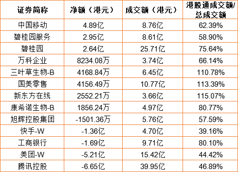 亚汇网11月25日港股通数据统计显示:中国移动(600941)净买入额居首,达4.89亿港元,腾讯控股净卖出额居第一位。(亚汇网编辑:陌尘)