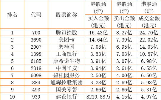 港股通(沪)买卖前十股(单位:港元):