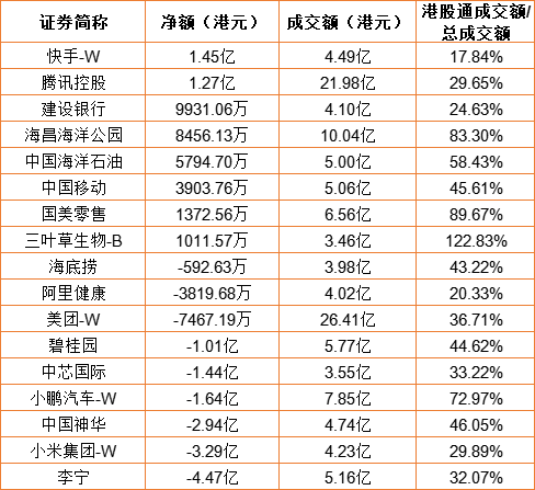 亚汇网12月2日港股通数据统计显示:快手-W净买入额居首,达1.45亿港元,李宁净卖出额居第一位。(亚汇网编辑:陌尘)