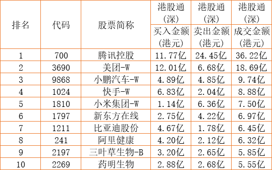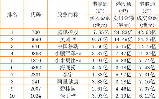 亚汇网实时数据统计:截至12月5日收盘,腾讯控股、美团-W、中国移动位居港股通(沪)成交前三,腾讯控股、美团-W、小鹏汽车-W位居股通(深)成交前三。