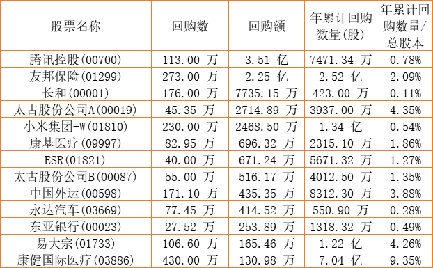 东亚银行(00023)、新鸿基公司(00086)、长和(00001)、康健国际医疗(03886)、亿都(国际控股)(00259)、天福(06868)、腾讯控股(00700)、清科创业(01945)、兴胜创建(00896)、友邦保险(01299)、中国外运(00598)、太古股份公司A(00019)、太古股份公司B(00087)、美亨实业(01897)、易大宗(01733)、天伦燃气(01600)、永达汽车(03669)、圣诺医药-B(02257)、彩客新能源(01986)、小米集团-W(01810)、康圣环球(09960)、ESR(01821)、北京能源国际(00686)、康基医疗(09997)、上实城市开发(00563)于2022年12月7日进行了回购。其中,回购金额最大的为腾讯控股(00700),回购数量113.00 万,回购金额3.51 亿元。