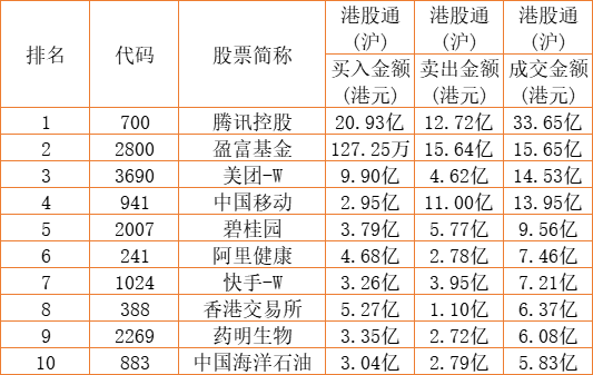 港股通(沪)买卖前十股(单位:港元):