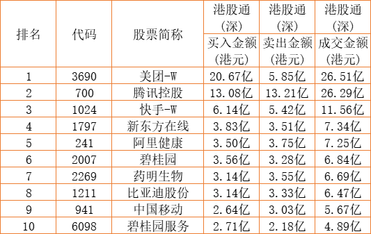 港股通(深)买卖前十股(单位:港元):