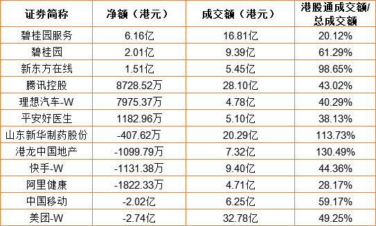 亚汇网12月12日港股通数据统计显示:碧桂园服务净买入额居首,达6.16亿港元,美团-W净卖出额居第一位。(亚汇网编辑:陌尘)