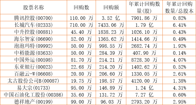 摩比发展(00947)、中国外运(00598)、长城汽车(02333)、东亚银行(00023)、德祥地产(00199)、彩星集团(00635)、兴胜创建(00896)、民银资本(01141)、泡泡玛特(09992)、天福(06868)、中国石油化工股份(00386)、亿都(国际控股)(00259)、天伦燃气(01600)、圣诺医药-B(02257)、蓝河控股(00498)、康健国际医疗(03886)、中裕能源(03633)、清科创业(01945)、景福集团(00280)、百融云-W(06608)、腾讯控股(00700)、易大宗(01733)、太古股份公司B(00087)、美亨实业(01897)、北京能源国际(00686)、中升控股(00881)、海尔智家(06690)于2022年12月13日进行了回购。其中,回购金额最大的为腾讯控股(00700),回购数量110.00 万,回购金额3.52 亿元。
