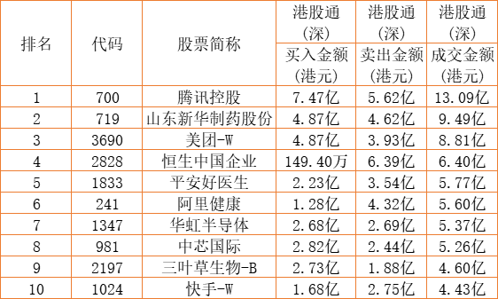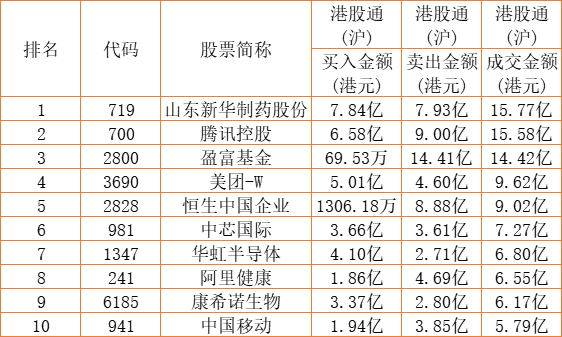 亚汇网实时数据统计:截至12月14日收盘,山东新华制药股份、盈富基金位居港股通(沪)成交前三,腾讯控股、山东新华制药股份、美团-W位居股通(深)成交前三。