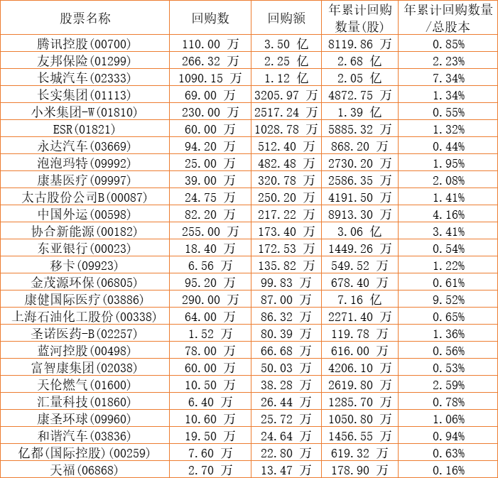 和谐汽车(03836)、长城汽车(02333)、摩比发展(00947)、东亚银行(00023)、酷派集团(02369)、上海石油化工股份(00338)、天福(06868)、泡泡玛特(09992)、腾讯控股(00700)、金利来集团(00533)、兴胜创建(00896)、民银资本(01141)、中国外运(00598)、蓝河控股(00498)、天伦燃气(01600)、友邦保险(01299)、金茂源环保(06805)、康健国际医疗(03886)、汇量科技(01860)、小米集团-W(01810)、美亨实业(01897)、清科创业(01945)、太古股份公司B(00087)、圣诺医药-B(02257)、永达汽车(03669)、亿都(国际控股)(00259)、长实集团(01113)、移卡(09923)、康圣环球(09960)、协合新能源(00182)、上实城市开发(00563)、ESR(01821)、康基医疗(09997)于2022年12月15日进行了回购。其中,回购金额最大的为腾讯控股(00700),回购数量110.00 万,回购金额3.50 亿元。
