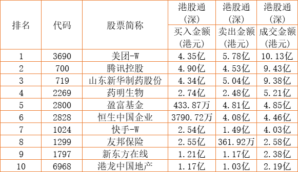 港股通(深)买卖前十股(单位:港元):