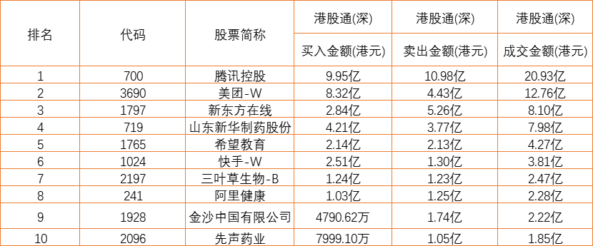 亚汇网实时数据统计:截至12月19日收盘,腾讯控股、美团-W、山东新华制药股份位居港股通(沪)成交前三,腾讯控股、美团-W、新东方在线位居股通(深)成交前三。