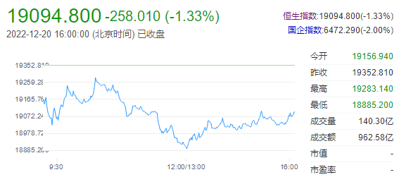 港股三大指数再度下跌,恒生科技指数一度跌至4.3%,收跌3.12%,恒指、国指分别跌1.33%和2%,恒指险守19000点。南下资金净流出1.38亿港元,大市成交额不足千亿港元。