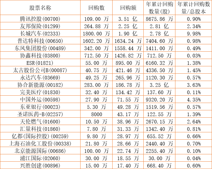 长城汽车(02333)、新鸿基公司(00086)、东亚银行(00023)、摩比发展(00947)、龙资源(01712)、腾讯控股(00700)、太古股份公司B(00087)、蓝河控股(00498)、亿都(国际控股)(00259)、中国外运(00598)、天福(06868)、朗生医药(00503)、普达特科技(00650)、友邦保险(01299)、完美医疗(01830)、上海石油化工股份(00338)、汇量科技(01860)、清科创业(01945)、圣诺医药-B(02257)、创胜集团-B(06628)、天伦燃气(01600)、协鑫科技(03800)、协合新能源(00182)、永达汽车(03669)、ESR(01821)、浦江国际(02060)、上实城市开发(00563)、北京能源国际(00686)于2022年12月22日进行了回购。其中,回购金额最大的为腾讯控股(00700),回购数量109.00 万,回购金额3.51 亿元。