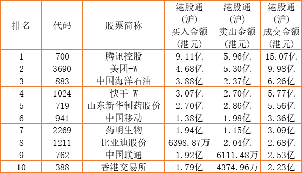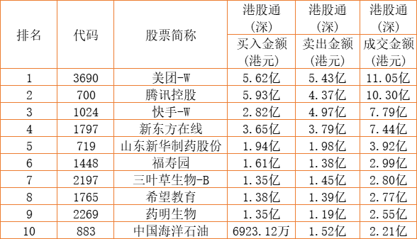 亚汇网实时数据统计:截至12月23日收盘,腾讯控股、美团-W、中国海洋石油位居港股通(沪)成交前三,美团-W、腾讯控股、快手-W位居股通(深)成交前三。