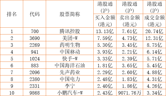 港股通(沪)买卖前十股(单位:港元):