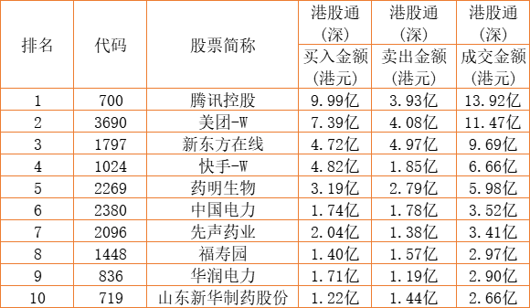港股通(深)买卖前十股(单位:港元):