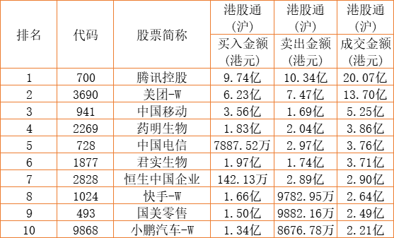 港股通(沪)买卖前十股(单位:港元):