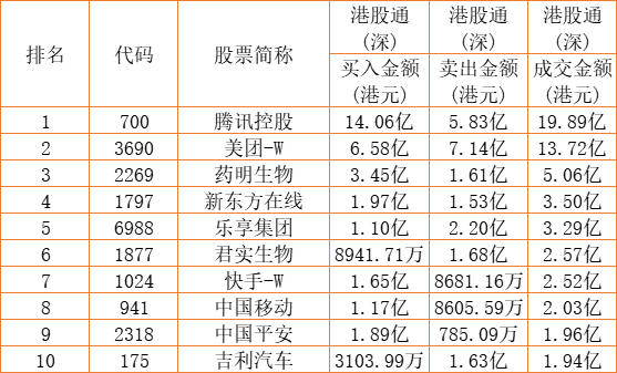 港股通(深)买卖前十股(单位:港元):