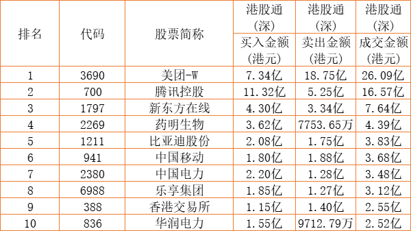 亚汇网实时数据统计:截至1月3日收盘,腾讯控股、美团-W、恒生中国企业位居港股通(沪)成交前三,美团-W、腾讯控股、新东方在线位居股通(深)成交前三。