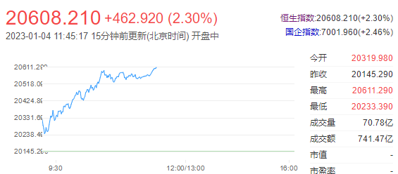 港股三大指数2023年第二个交易日上午涨幅强势,恒指午间收涨2.3%创约5个月新高,恒生科技指数涨3.39%,国指涨2.46%。南下资金半日净流入49.55亿港元,大市成交额为741亿港元。