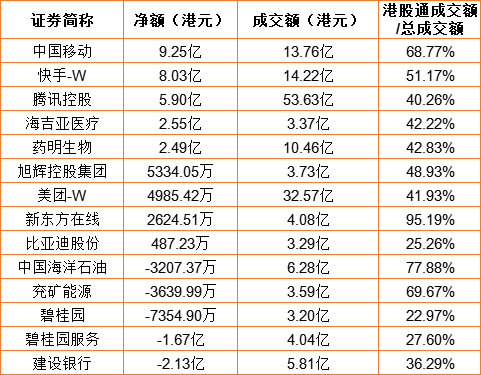 亚汇网1月4日港股通数据统计显示:中国移动(600941)净买入额居首,达9.25亿港元,建设银行净卖出额居第一位。(亚汇网编辑:陌尘)