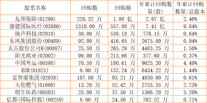 朗生医药(00503)、富智康集团(02038)、中国外运(00598)、新鸿基公司(00086)、清科创业(01945)、蓝河控股(00498)、东风集团股份(00489)、亿都(国际控股)(00259)、兴胜创建(00896)、天伦燃气(01600)、汇量科技(01860)、太古股份公司B(00087)、康健国际医疗(03886)、阳光纸业(02002)、瑞声科技(02018)、ESR(01821)、友邦保险(01299)、康圣环球(09960)、浦江国际(02060)于2023年1月4日进行了回购。其中,回购金额最大的为友邦保险(01299),回购数量220.32 万,回购金额1.98 亿元。