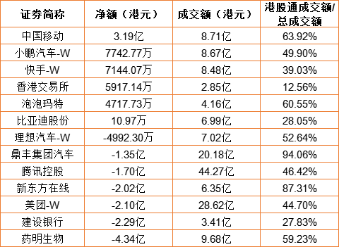 亚汇网1月6日港股通数据统计显示:中国移动(600941)净买入额居首,达3.19亿港元,药明生物净卖出额居第一位。(亚汇网编辑:陌尘)