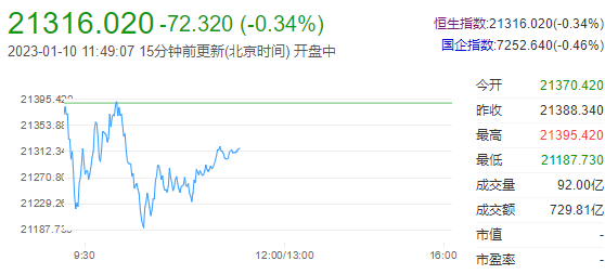 港股上午盘三大指数表现疲弱,恒指盘中一度跌至1%,午间收跌0.34%,国指跌0.46%,恒生科技指数跌0.69%。南下资金半日净流入19.75亿港元,大市成交额为729亿港元。
