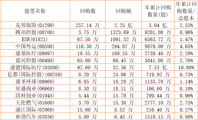 和谐汽车(03836)、摩比发展(00947)、新鸿基公司(00086)、中国外运(00598)、清科创业(01945)、腾讯控股(00700)、亿都(国际控股)(00259)、蓝河控股(00498)、康健国际医疗(03886)、天伦燃气(01600)、朗生医药(00503)、友邦保险(01299)、星盛商业(06668)、ESR(01821)、康圣环球(09960)、康基医疗(09997)、浦江国际(02060)于2023年1月9日进行了回购。其中,回购金额最大的为友邦保险(01299),回购数量257.14 万,回购金额2.25 亿元。