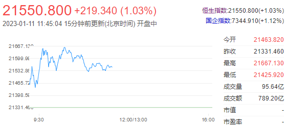 港股上午盘三大指数再度走强,恒生科技指数一度涨至1.8%,午间收涨1.08%,恒指、国指分别涨1.02%和1.12%,三者齐刷阶段新高。