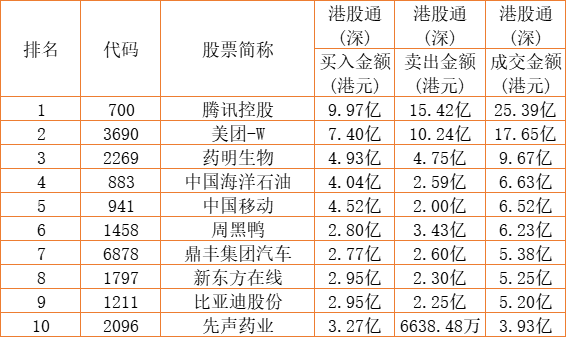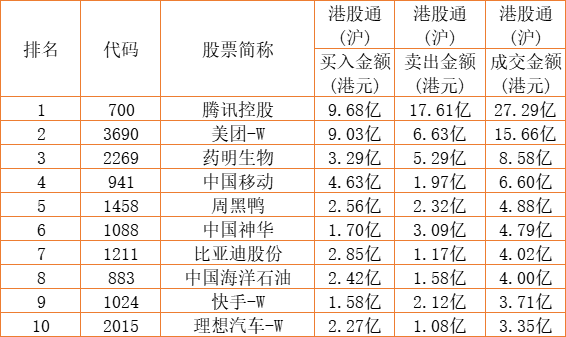 亚汇网实时数据统计:截至1月11日收盘,腾讯控股、美团-W、药明生物位居港股通(沪)成交前三,腾讯控股、美团-W、药明生物位居股通(深)成交前三。