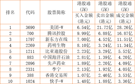 港股通(深)买卖前十股(单位:港元):
