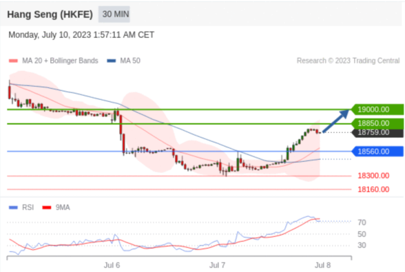 交易策略: 在 18560.00 之上,看涨,目标价位为 18850.00 ,然后为 19000.00 。