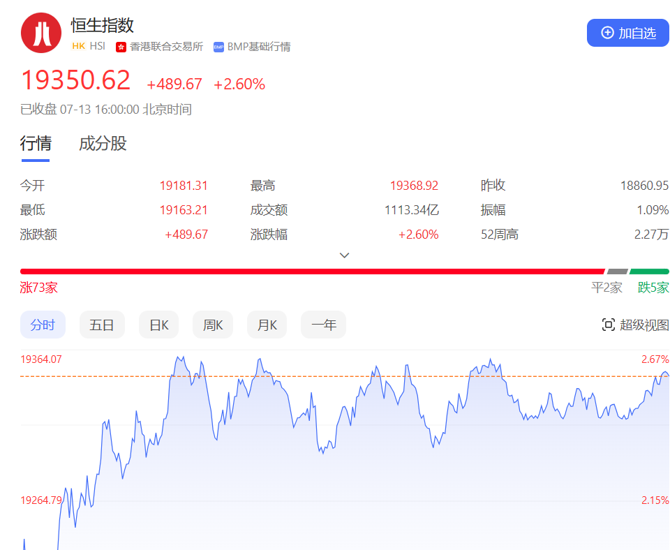 香港恒生指数开盘涨1.7%,三大指数全天维持高位震荡。截止收盘,恒生指数涨2.6%或489.67点,报19350.62点,全日成交额1113.34亿港元;恒生国企指数涨2.6%,报6543.91点;恒生科技指数涨3.82%,报4237.09点。