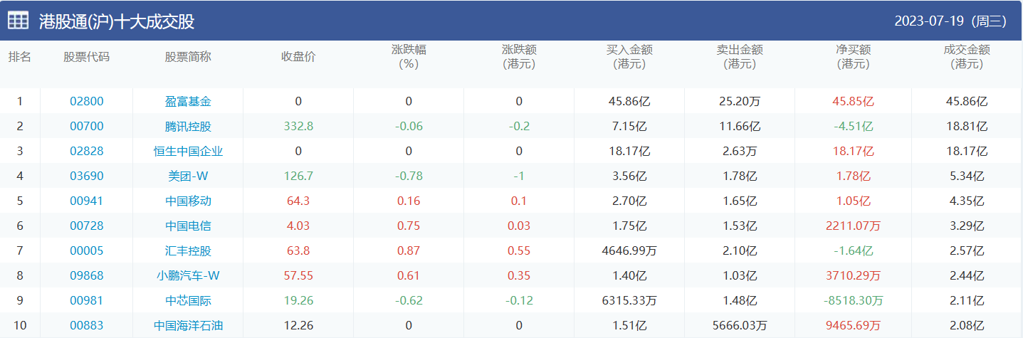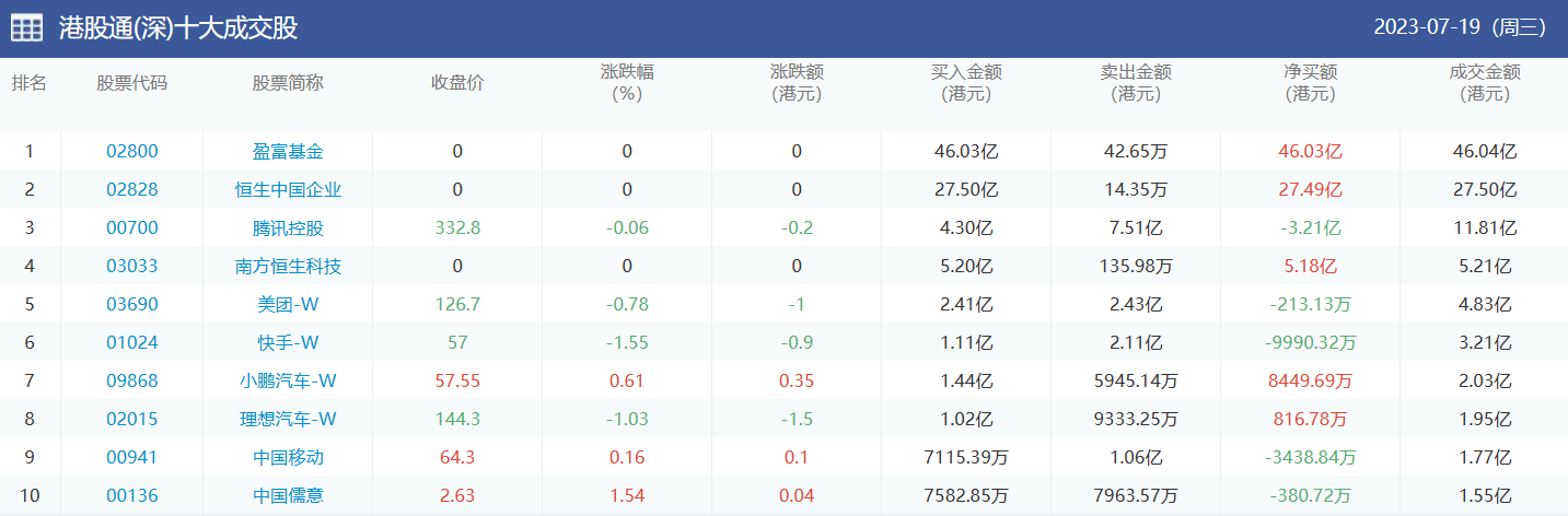 亚汇网实时数据统计:截至7月20日收盘,盈富基金、腾讯控股、恒生中国企业位居港股通(沪)成交前三,盈富基金、恒生中国企业、腾讯控股位居股通(深)成交前三。
