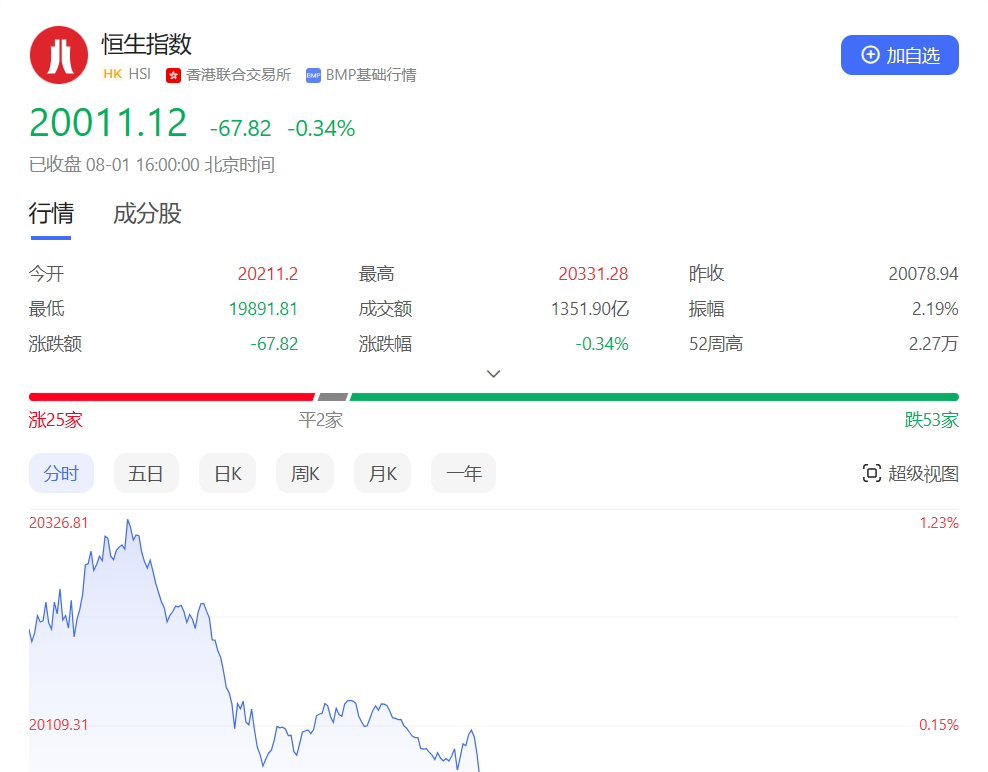 香港恒生指数开盘涨0.66%,早盘恒指小幅冲高,盘中一度涨近250点,此后全天呈震荡走弱态势。截止收盘,恒生指数跌0.34%或67.82点,报20011.12点,全日成交额1351.9亿港元;恒生国企指数跌0.65%,报6854.52点;恒生科技指数跌0.26%,报4538.1点。