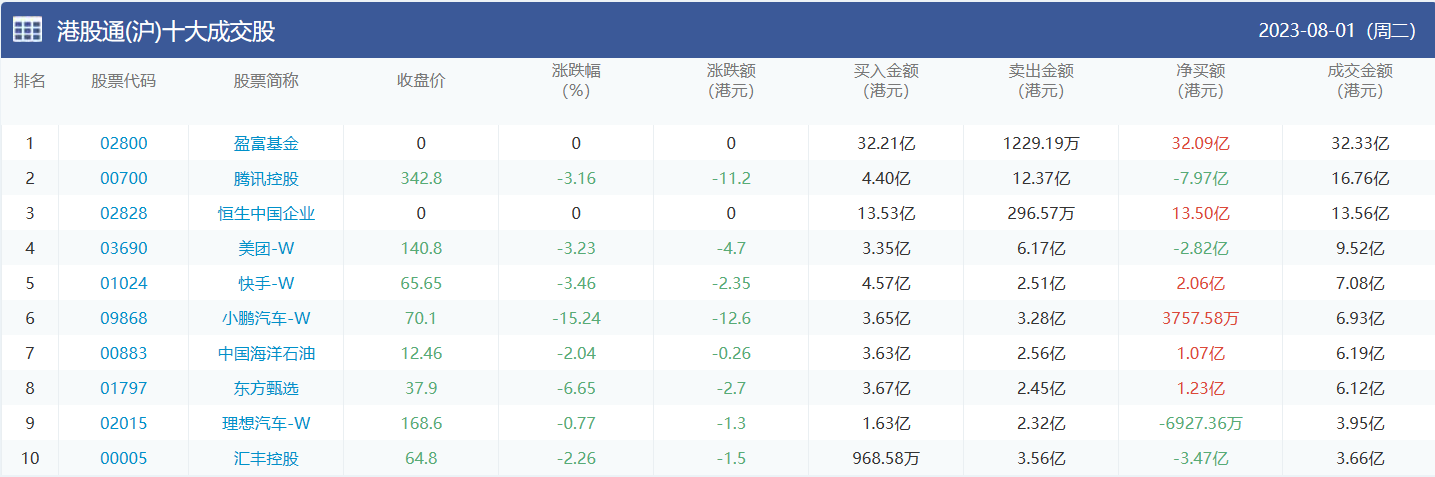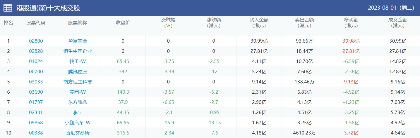 亚汇网实时数据统计:截至8月2日收盘,盈富基金、腾讯控股、恒生中国企业位居港股通(沪)成交前三,盈富基金、恒生中国企业、快手-w位居股通(深)成交前三。