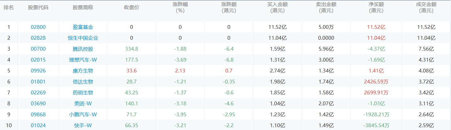 亚汇网8月8日港股通数据统计显示:盈富基金净买入额居首,达11.52亿港元,腾讯控股净卖出额居第一位。(亚汇网编辑:静香)