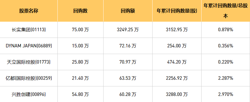 8月9日港股回购概况:DYNAM JAPAN(06889)、兴胜创建(00896)、亿都(国际控股)(00259)、长实集团(01113)、天立国际控股(01773)于2023年8月8日进行了回购。其中,回购金额最大的为长实集团(01113),回购数量75.00 万,回购金额3249.25 万元。