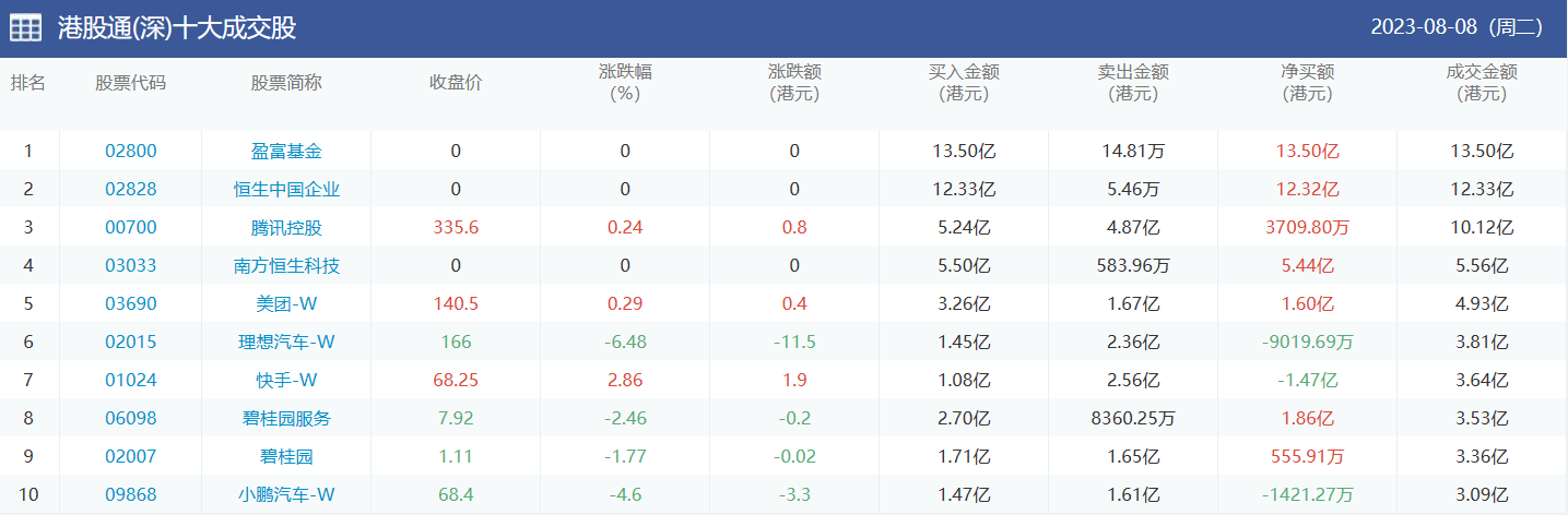 亚汇网实时数据统计:截至8月9日收盘,盈富基金、腾讯控股、美团-w位居港股通(沪)成交前三,盈富基金、恒生中国企业、腾讯控股位居股通(深)成交前三。