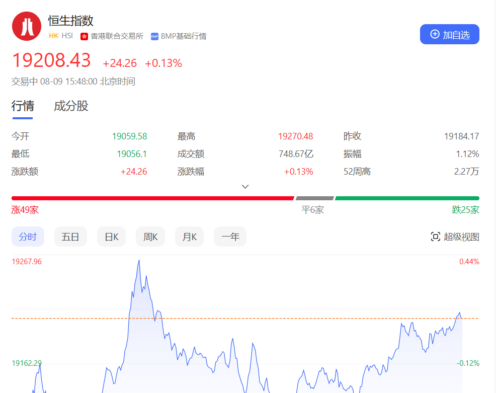 香港恒生指数开盘跌0.65%,早盘恒指低开后震荡下挫,一度跌超115点,随后企稳反弹并小幅翻红,此后上涨乏力,呈弱势运行。截止收盘,恒生指数涨0.32%或61.86点,报19246.03点,全日成交额850.39亿港元;恒生国企指数涨0.39%,报6613.23点;恒生科技指数跌0.01%,报4373.71点。