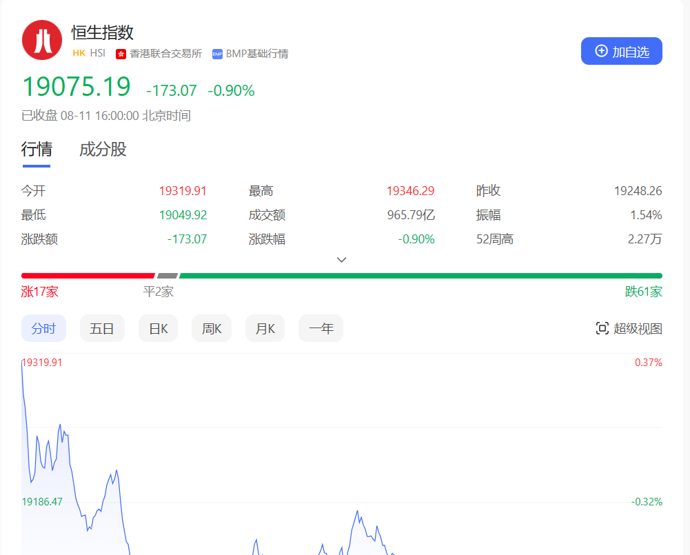 香港恒生指数开盘涨0.37%,三大指数早盘集体高开,此后全天呈现震荡下行态势。截止收盘,恒生指数跌0.9%或173.07点,报19075.19点,本周累跌2.38%,全日成交额965.79亿港元;恒生国企指数跌1.33%,报6540.63点;恒生科技指数跌2.39%,报4273.19点。