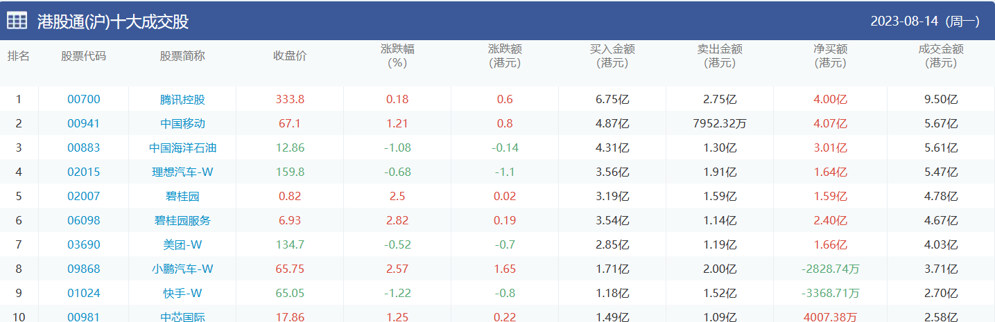 亚汇网实时数据统计:截至8月15日收盘,腾讯控股、中国移动、中国海洋石油位居港股通(沪)成交前三,盈富基金、腾讯控股、恒生中国企业位居股通(深)成交前三。