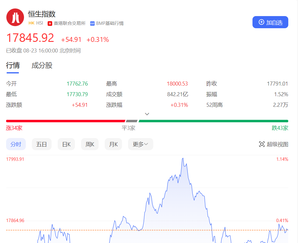香港恒生指数开盘涨0.82%,三大指数全天震荡走高,恒科指盘中一度涨超4%。截止收盘,恒生指数涨2.05%或366.25点,报18212.17点,全日成交额1015.2亿港元;恒生国企指数涨2.46%,报6267.95点;恒生科技指数涨3.72%,报4158.02点。