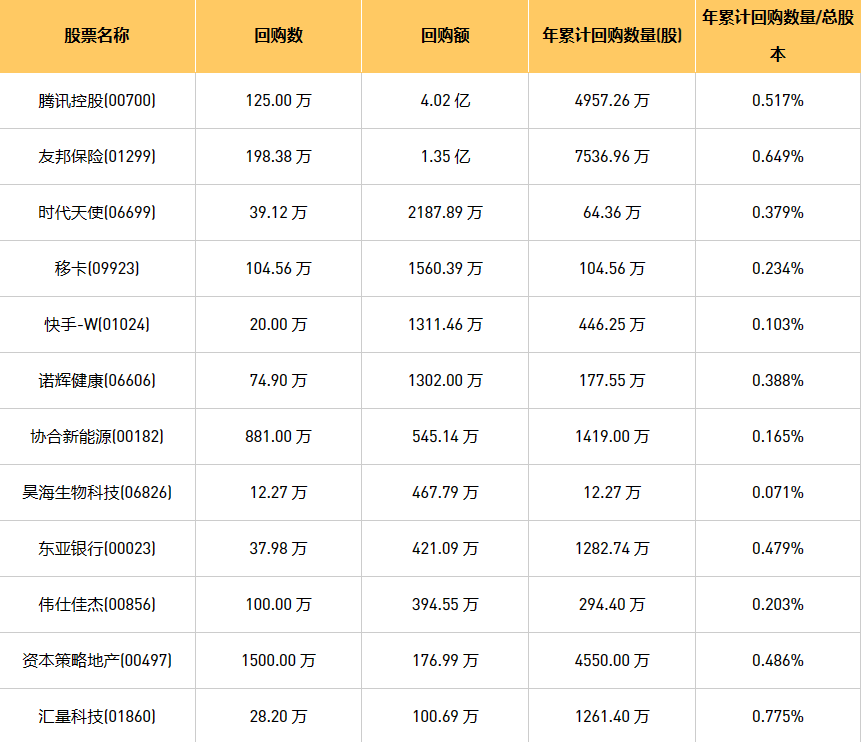 8月28日港股回购概况:摩比发展(00947)、兴胜创建(00896)、DYNAM JAPAN(06889)、亿胜生物科技(01061)、百宏实业(02299)、亿都(国际控股)(00259)、天福(06868)、东亚银行(00023)、伟仕佳杰(00856)、资本策略地产(00497)、亚洲联合基建控股(00711)、腾讯控股(00700)、汇量科技(01860)、彩客新能源(01986)、清科创业(01945)、新鸿基公司(00086)、时代天使(06699)、友邦保险(01299)、诺辉健康(06606)、赛晶科技(00580)、天立国际控股(01773)、ESR(01821)、昊海生物科技(06826)、康圣环球(09960)、移卡(09923)、协合新能源(00182)、快手-W(01024)、元征科技(02488)于2023年8月25日进行了回购。其中,回购金额最大的为腾讯控股(00700),回购数量125.00 万,回购金额4.02 亿元。