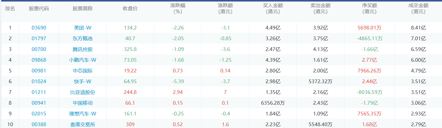 亚汇网8月30日港股通数据统计显示:美团-w净买入额居首,达4.49亿港元,腾讯控股净卖出额居第一位。(亚汇网编辑:静香)