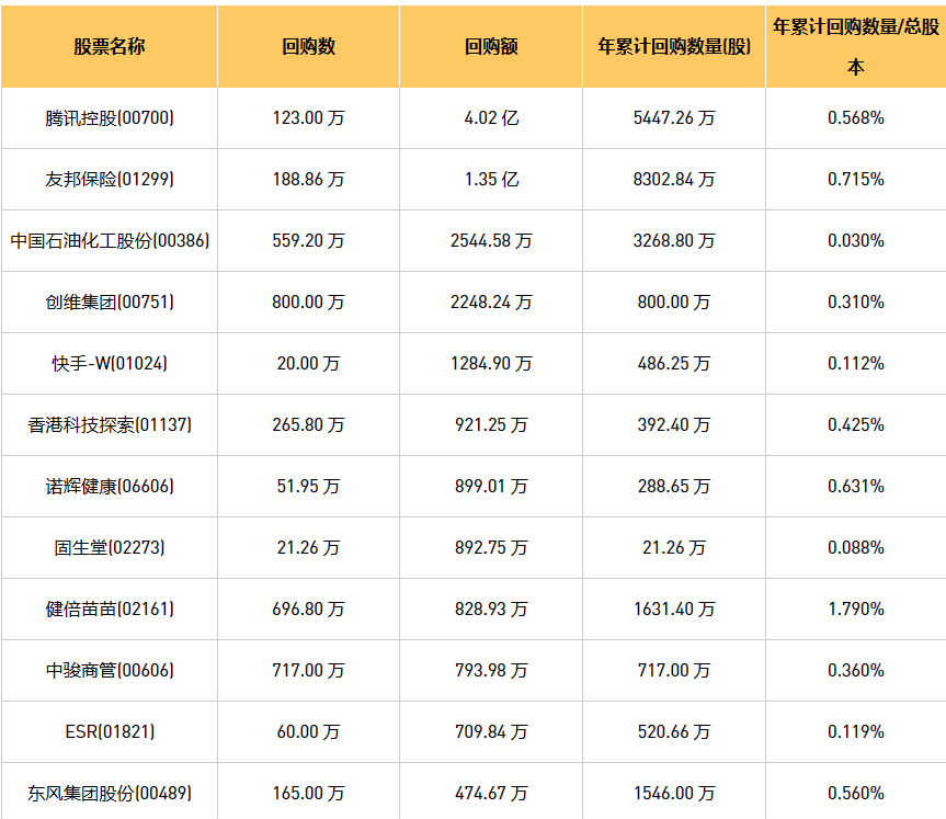 9月1日港股回购概况:摩比发展(00947)、东亚银行(00023)、富智康集团(02038)、永安国际(00289)、亿胜生物科技(01061)、首佳科技(00103)、中国石油化工股份(00386)、DYNAM JAPAN(06889)、天福(06868)、亿都(国际控股)(00259)、创维集团(00751)、绿城服务(02869)、腾讯控股(00700)、东风集团股份(00489)、新鸿基公司(00086)、友邦保险(01299)、金科服务(09666)、民银资本(01141)、中骏商管(00606)、健倍苗苗(02161)、彩客新能源(01986)、香港科技探索(01137)、歌礼制药-B(01672)、创胜集团-B(06628)、同道猎聘(06100)、固生堂(02273)、汇量科技(01860)、赛晶科技(00580)、加科思-B(01167)、ESR(01821)、诺辉健康(06606)、快手-W(01024)、思派健康(00314)、天立国际控股(01773)、美丽田园医疗健康(02373)、星盛商业(06668)、康圣环球(09960)、元征科技(02488)于2023年8月31日进行了回购。其中,回购金额最大的为腾讯控股(00700),回购数量123.00 万,回购金额4.02 亿元。