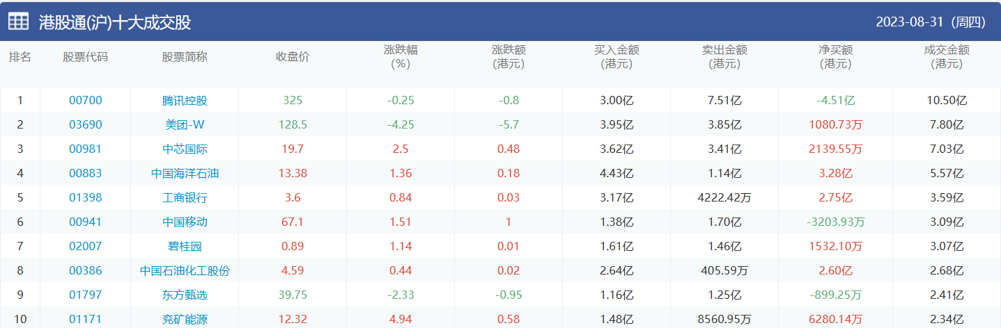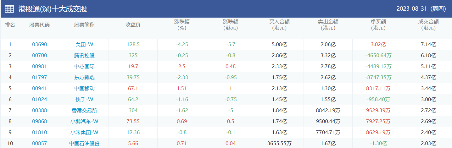 亚汇网实时数据统计:截至9月1日收盘,腾讯控股、美团-w、中芯国际位居港股通(沪)成交前三,美团-w、腾讯控股、中芯国际位居股通(深)成交前三。