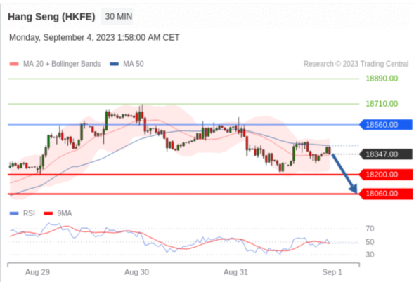 香港恒生指数期货 (U3) 当日内交易策略: 在 18560.00 之下 目标价位为 18200.00 (20230904)