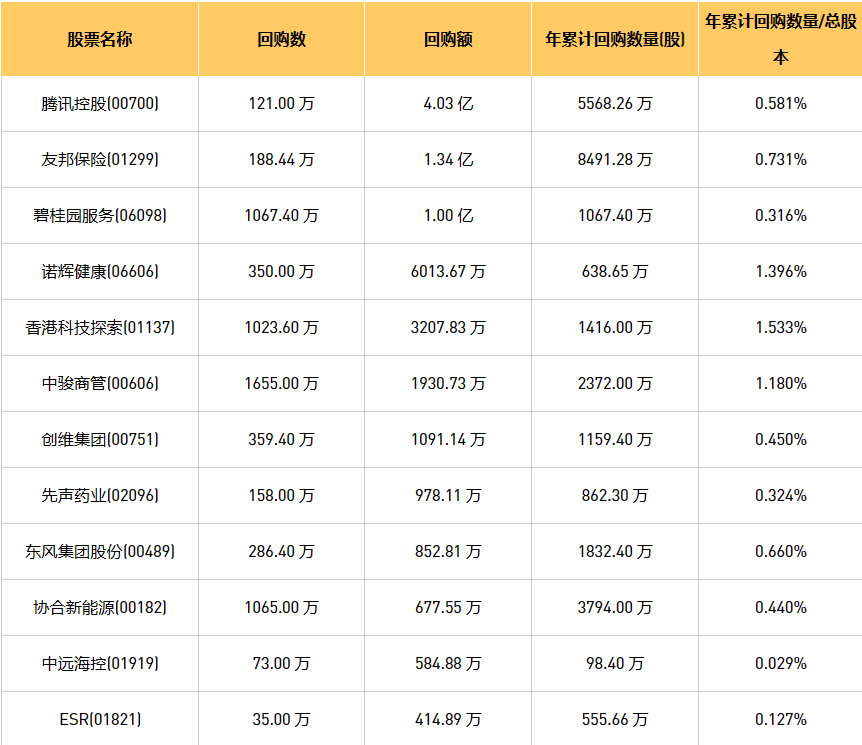 9月5日港股回购概况:伟仕佳杰(00856)、摩比发展(00947)、亚洲金融(00662)、晨讯科技(02000)、亿胜生物科技(01061)、DYNAM JAPAN(06889)、东亚银行(00023)、中骏商管(00606)、创维集团(00751)、清科创业(01945)、金科服务(09666)、新鸿基公司(00086)、中远海控(0)、同道猎聘(06100)、腾讯控股(00700)、东风集团股份(00489)、天福(06868)、亿都(国际控股)(00259)、歌礼制药-B(01672)、碧桂园服务(06098)、彩客新能源(01986)、民银资本(01141)、友邦保险(01299)、先声药业(02096)、ESR(01821)、汇量科技(01860)、现代牙科(03600)、诺辉健康(06606)、赛晶科技(00580)、天立国际控股(01773)、元征科技(02488)、香港科技探索(01137)、星盛商业(06668)、康圣环球(09960)、协合新能源(00182)、立基工程控股(08369)于2023年9月4日进行了回购。其中,回购金额最大的为腾讯控股(00700),回购数量121.00 万,回购金额4.03 亿元。