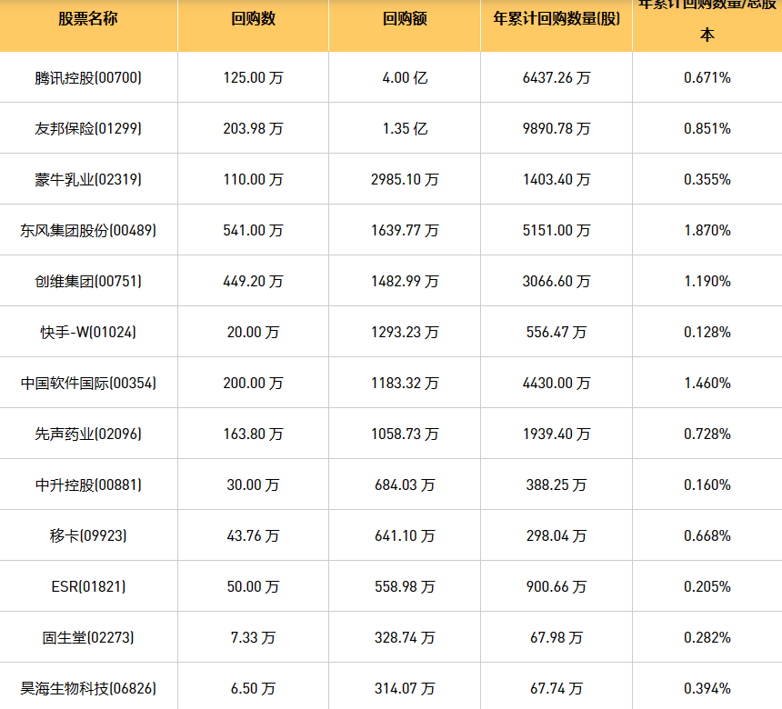 9月15日港股回购概况:伟仕佳杰(00856)、晨讯科技(02000)、摩比发展(00947)、DYNAM JAPAN(06889)、蒙牛乳业(02319)、创维集团(00751)、亚洲金融(00662)、绿城服务(02869)、固生堂(02273)、首佳科技(00103)、中国软件国际(00354)、亿胜生物科技(01061)、新鸿基公司(00086)、天福(06868)、中远海控(0)、清科创业(01945)、昊海生物科技(06826)、东风集团股份(00489)、先声药业(02096)、腾讯控股(00700)、歌礼制药-B(01672)、友邦保险(01299)、百融云-W(06608)、彩客新能源(01986)、数码通电讯(00315)、思派健康(00314)、首程控股(00697)、旭日企业(00393)、天立国际控股(01773)、乐声电子(00213)、汇量科技(01860)、快手-W(01024)、现代牙科(03600)、中升控股(00881)、ESR(01821)、赛晶科技(00580)、移卡(09923)、康圣环球(09960)于2023年9月14日进行了回购。其中,回购金额最大的为腾讯控股(00700),回购数量125.00 万,回购金额4.00 亿元。